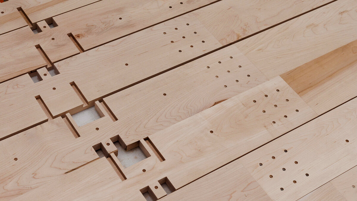 Finally for the floor, it was decided to use birch boards – which came closest to the colour and feel of maple, and was easiest to locally source in the special sizes that the project required. They were lightened in tone in order to maintain the visual continuity of construction lines as they travel across planes, running through the entire spatial frame.
