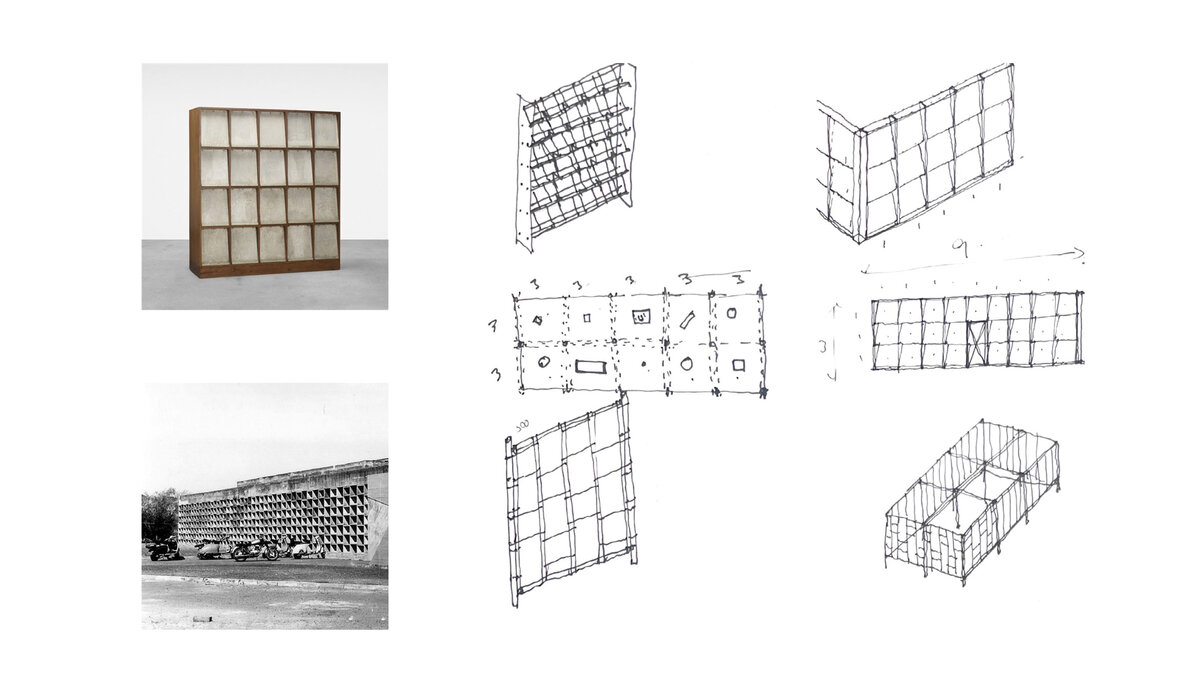 For the wall unit, the primary interface of the enclosure, David was keen on drawing inspiration from the integrated concrete brise-soleil Corbusier used across Chandigarh and Ahmedabad. His sense was to echo this configuration now using cloth as the facade. ‘We felt that fabric would provide a textural contrast with all the hard timber in the booth’. It would also allow an easy flow of light within the space, he thought. ’I loved the idea of a jagged fabric wall and instinctively veered towards it, among others David had presented,’ Aparna recalled. It also referred to the repetitive, slanting face of the iconic bookshelf designed by Pierre Jeanneret,’ I was bitten by the bug to make it come alive in a way I hadn't seen before.’.