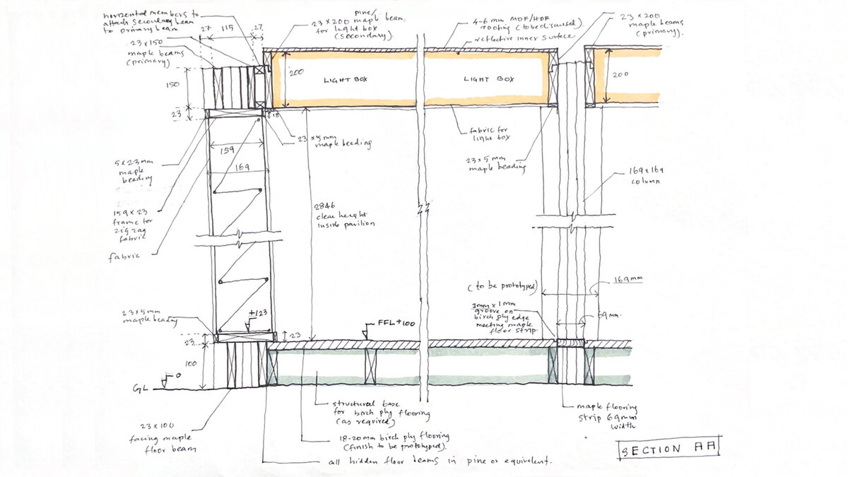 David delivered a clear, conceptual proposal; a strict framework; to then be inserted with one of 3 elements; a wall, a light box ceiling or a floor. The pillars and column were used in the exact post planing size, to minimise wastage. Each narrow plank was elongated using an elaborate dual system of temporary interlocking profiles and fasteners to enable the timber an afterlife beyond the 4 day span of the event – also a strong directive of AHEC’s. David proceeded to labour over a precise 2D geometry, imbibing all scales of construction with a thorough logic; from the size and location of dotted screw head caps to a complex joinery section all the way to the dimensions of the spatial grid itself. It was a process of constant triangulation within a very narrow error margin; any small adjustment at one scale; meant mirroring on every other. Aparna later reflected that, ‘It appealed to the closeted typographer in me, enough to disregard the challenges of scale at which PH can conceive and manage detail in production. It was irrational’.