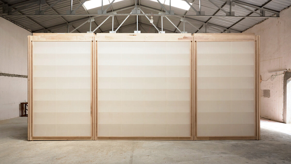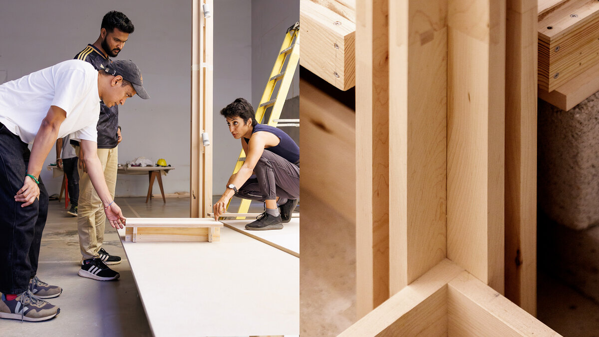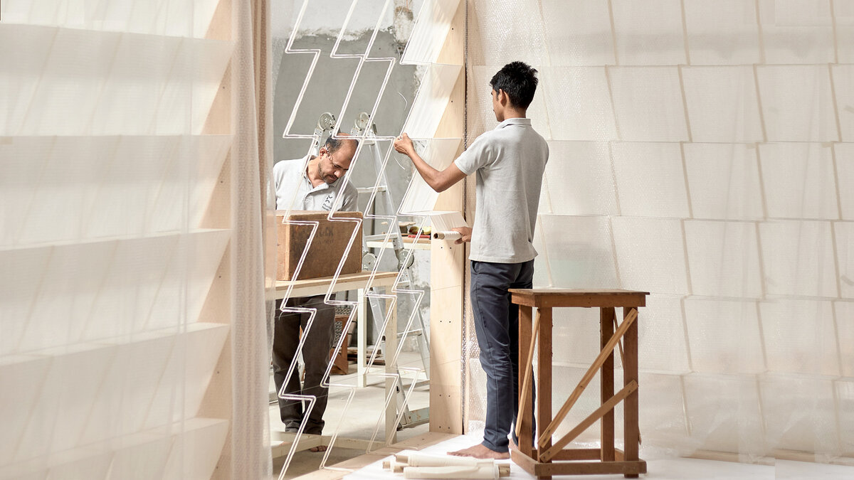 But even as these exciting experiments unfolded, the sudden jump in scale (‘from the making of a chair to that of something closer to a small cottage’ as Aparna put it) and the compulsion to produce the pavilion in-house, took a real toll on PH. The booth was 63 square metres in volume, and constructing it as a full-size exhibition, with a tight deadline proved demanding. The quantum of precise joinery – hundreds – needed for several slim maple planks to transform into a solid beam along with the ambitious multi-tiered fabric wall requiring very elaborate, delicate fitting– all required unanticipated time and effort. Aparna says, ‘We also didn't have the experience to know better – now we do.’