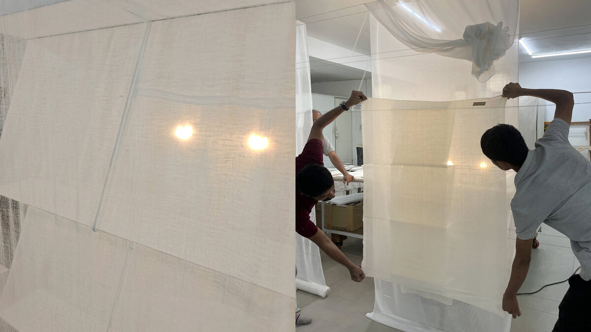 It was while envisioning how this could take shape, making quick trials with everyday materials from her art studio, Pors & Rao; and the skills of the PH tailors, that Aparna found herself becoming involved in the project. She approached the stepped wall structure by infusing a light weight fabric with rigidity, through the use of slim, tensioned steel cables and intermediate stiffening members. This enabled the delicate, gossamer-like muslin to take on a paper-like form, folding crisply around axes, while its anatomy remained discreet.
